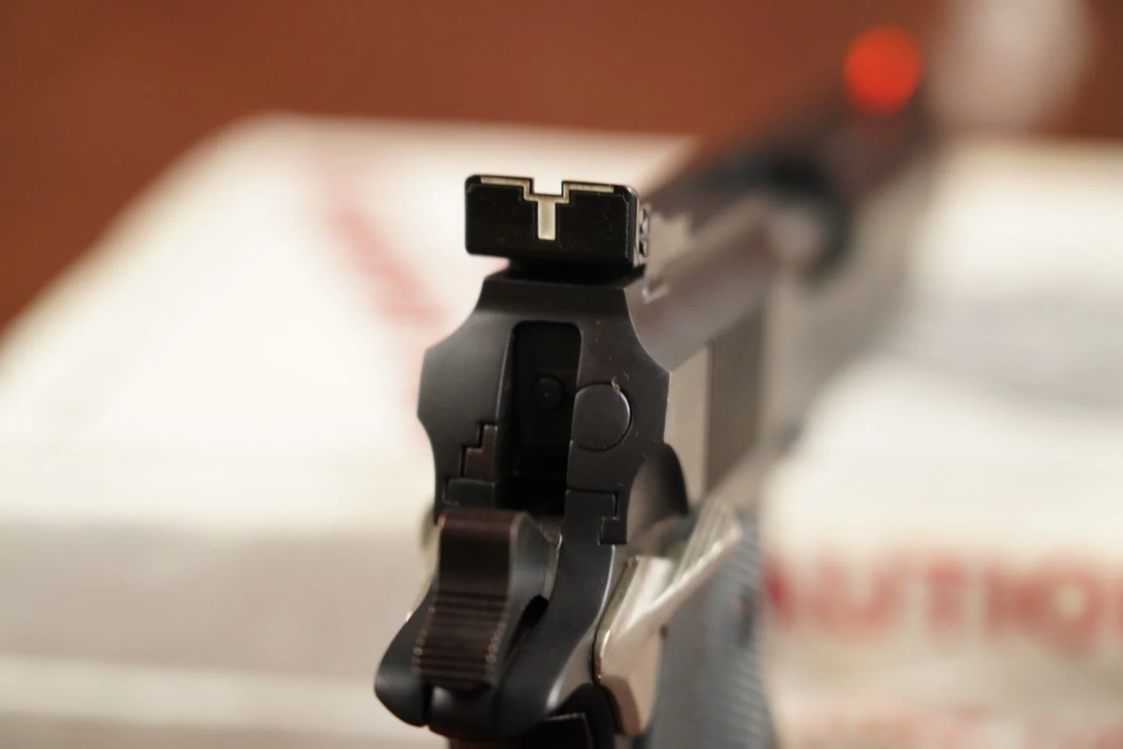 Equipped with Millett (Millet) adjustable target sights: a ramped front blade with blaze-orange “T” insert and an outlined square-notch rear sight in an adjustable base (windage & elevation). Rear sight is dovetailed and double screw-set to the slide for secure, repeatable adjustment.