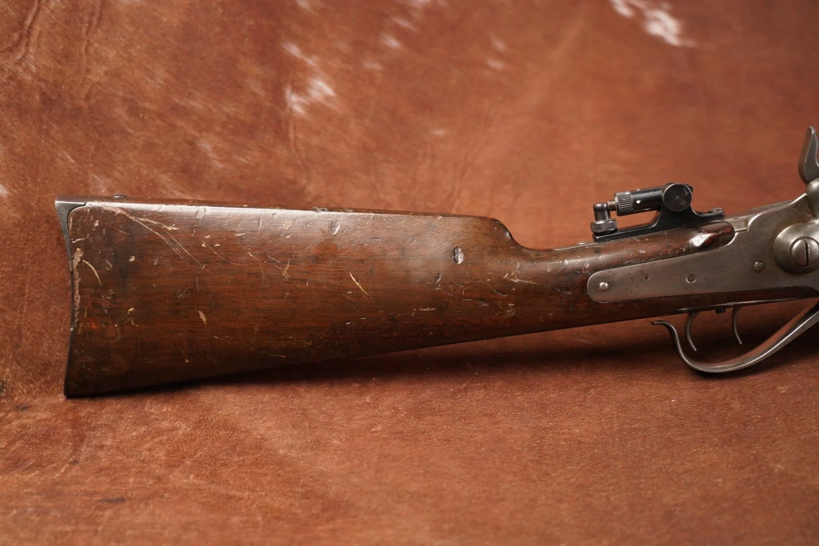 The so called Model 1874 was originally marked simply “New Model.” When the Model 1878 was introduced, the earlier design was retroactively referred to as the 1874. The Business Rifle variant was intended as a more economical alternative to the higher grade Sporting Rifle, offering practical features without elaborate embellishment. Only 1,604 Business Rifles were produced at the Bridgeport factory, making this configuration less common than many other Sharps models.