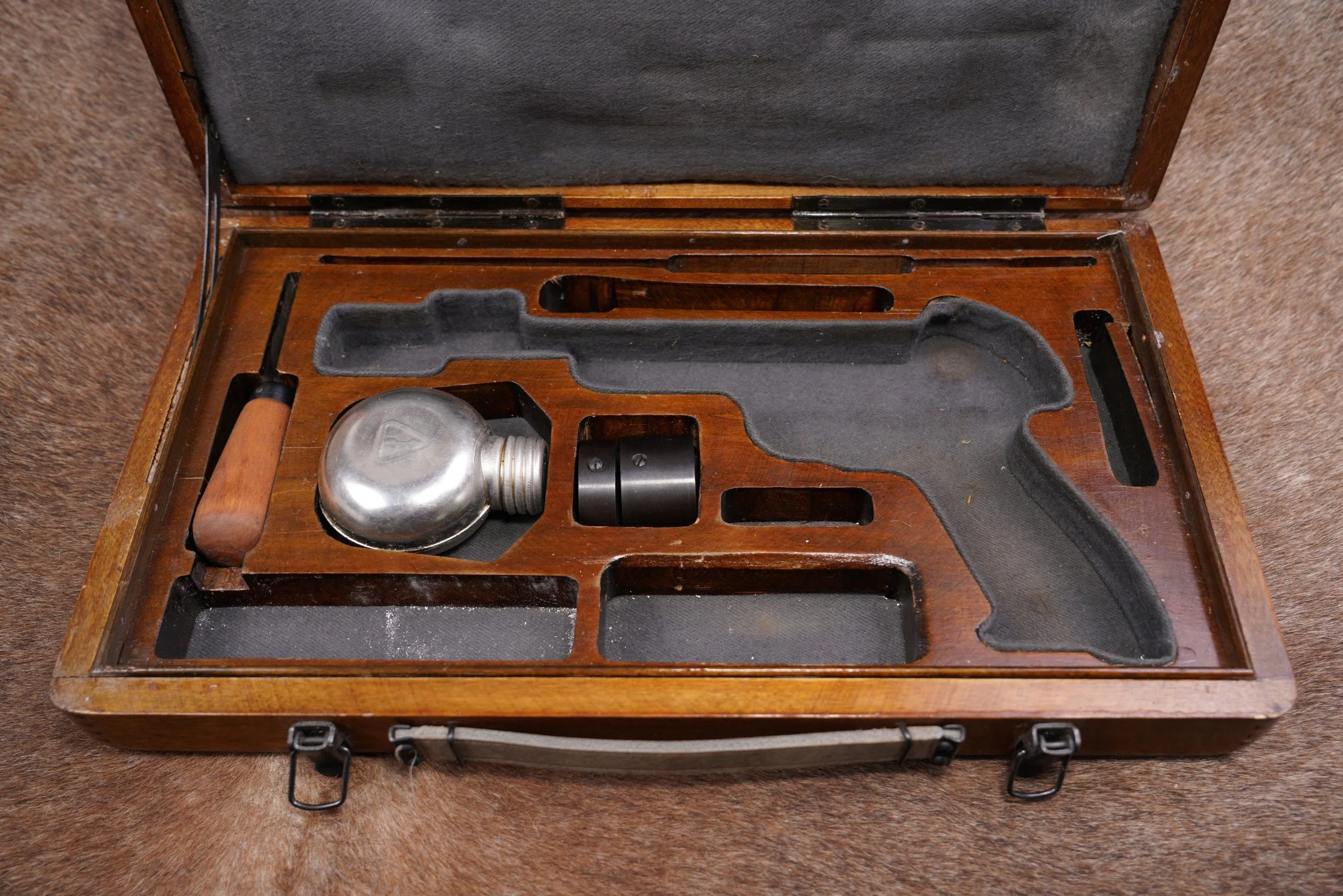 The Margolin MCM is one of the most distinctive target pistols of the Cold War era, admired for its accuracy, unconventional layout, and remarkable design history. Produced at Tula Arsenal in the Soviet Union, the MCM was built for precision competition and remains closely associated with Olympic style rimfire target shooting. This example includes its fitted wood case, spare parts, sight inserts, and accessories, making it an especially complete representation of the model.